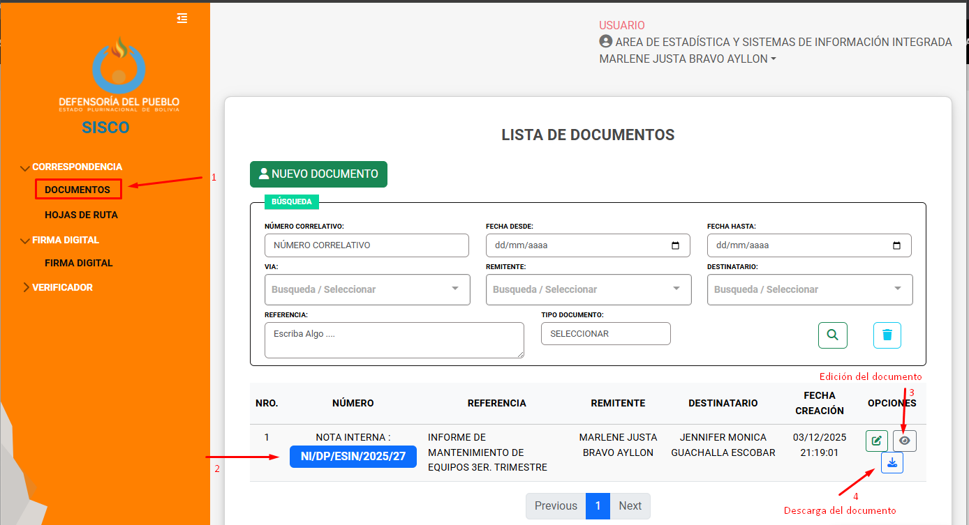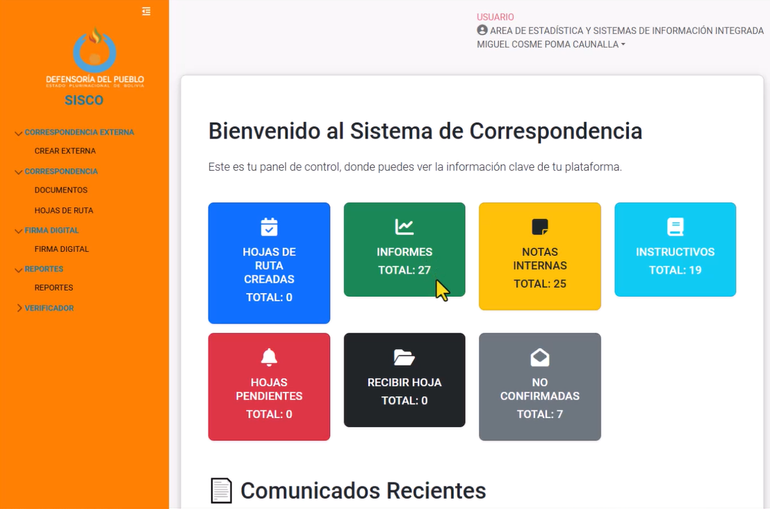 El presente Manual de Usuario tiene por objeto describir el funcionamiento del Sistema de Correspondencia Institucional (SISCO), detallando sus funcionalidades y procedimientos para la gestión de la correspondencia interna y externa. Incluye la generación de hojas de ruta, elaboración de documentos a partir de plantillas institucionales, firma digital interna, consulta y descarga de documentos y reportes.
