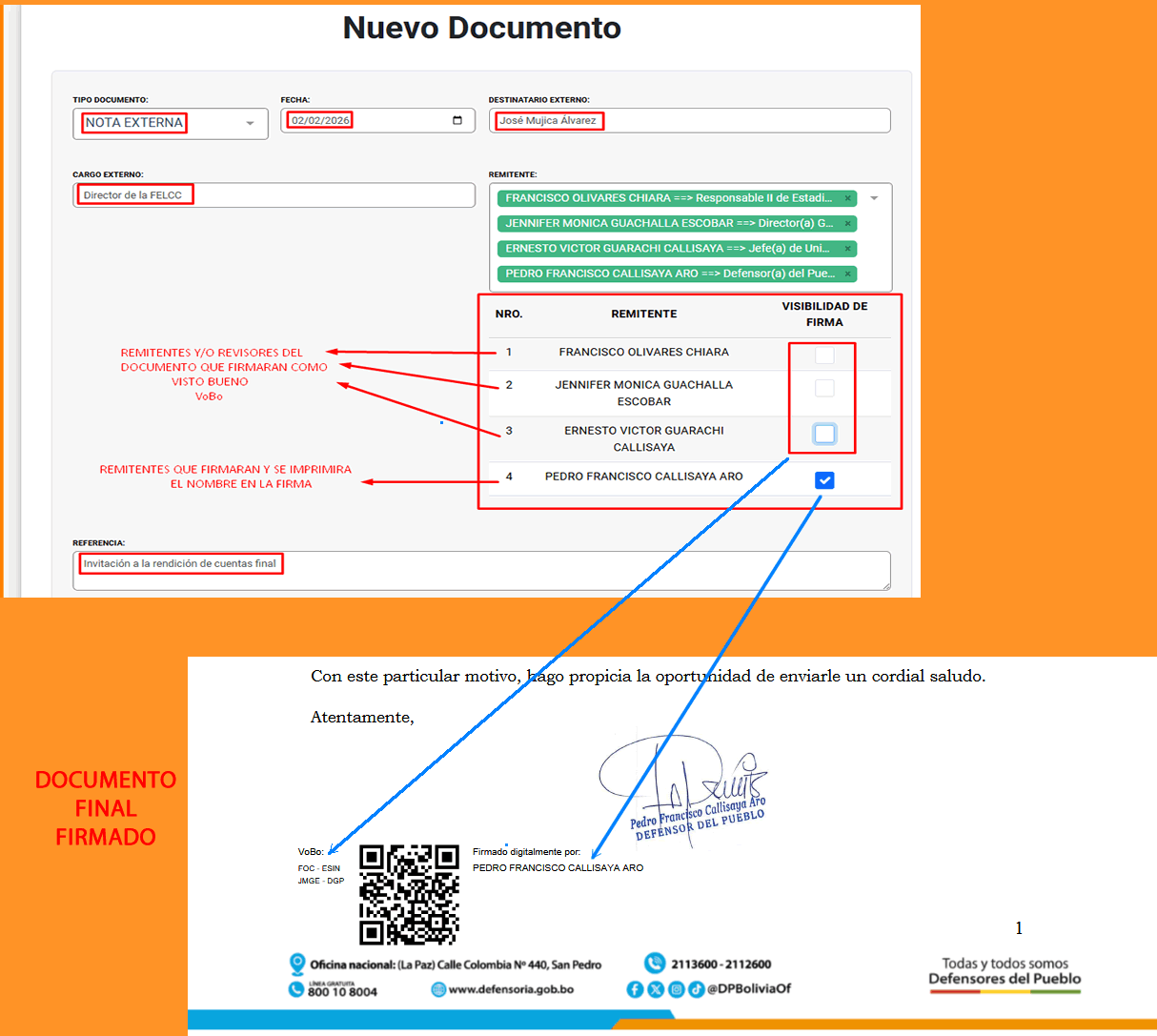Para que el inmediato superior u otro remitente que esta involucrado con el documentos, pueda firmar. El procedimiento es el siguiente: