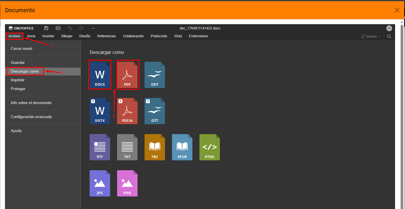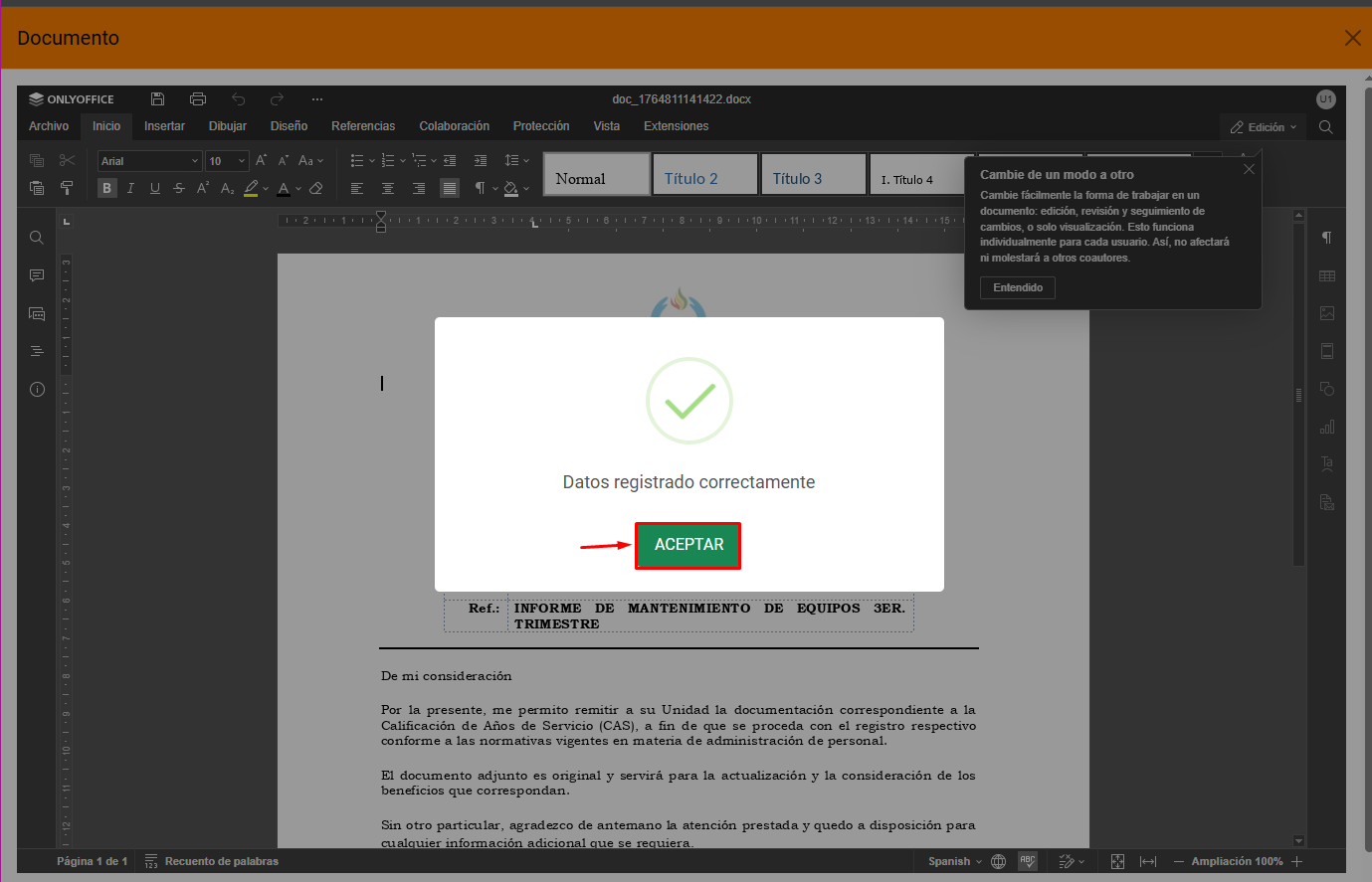 Posteriormente se mostrara el documento en el editor de OnlyOffice, donde se podrá editar la plantilla del documento de acuerdo a necesidad.