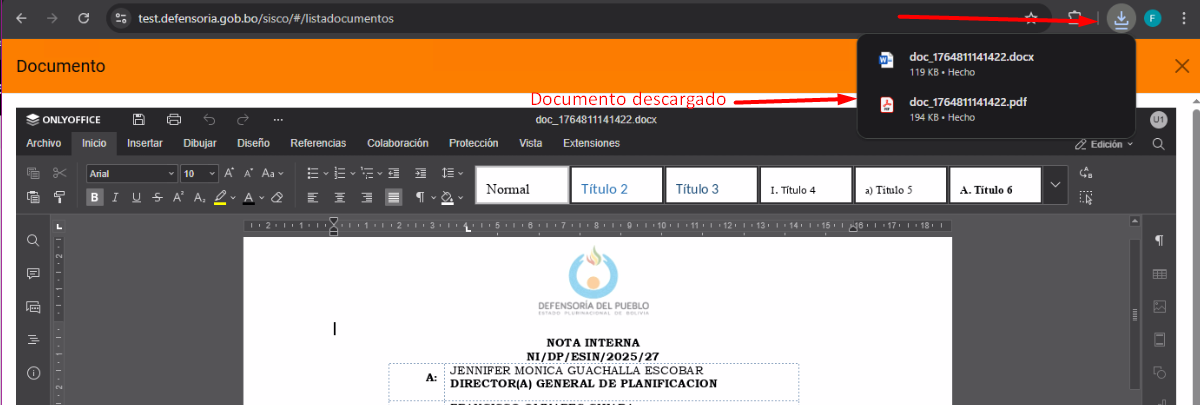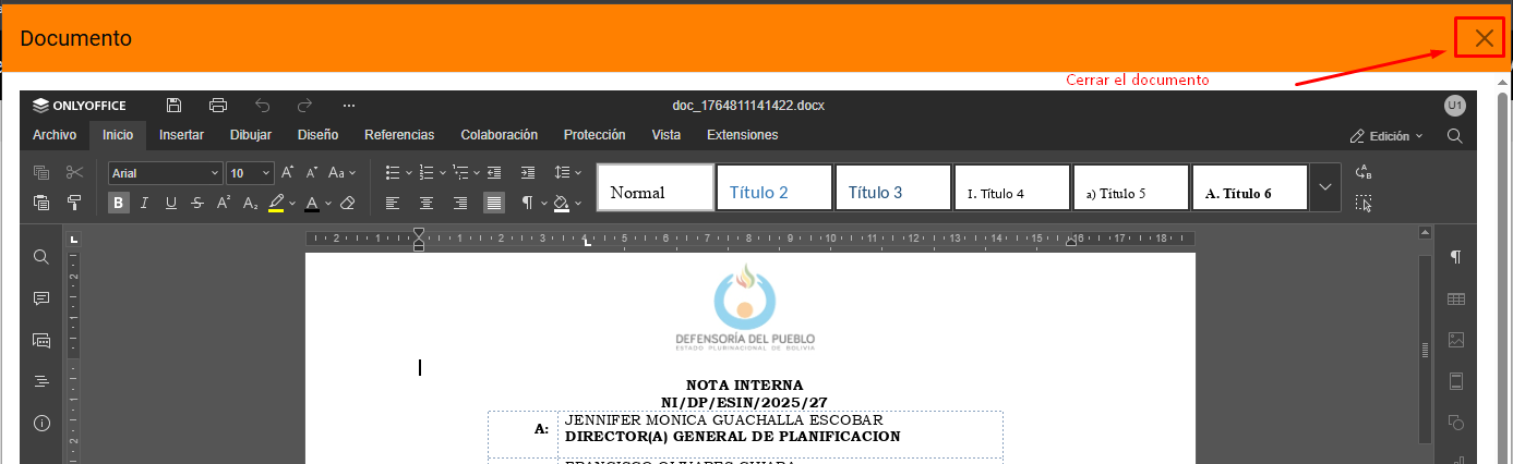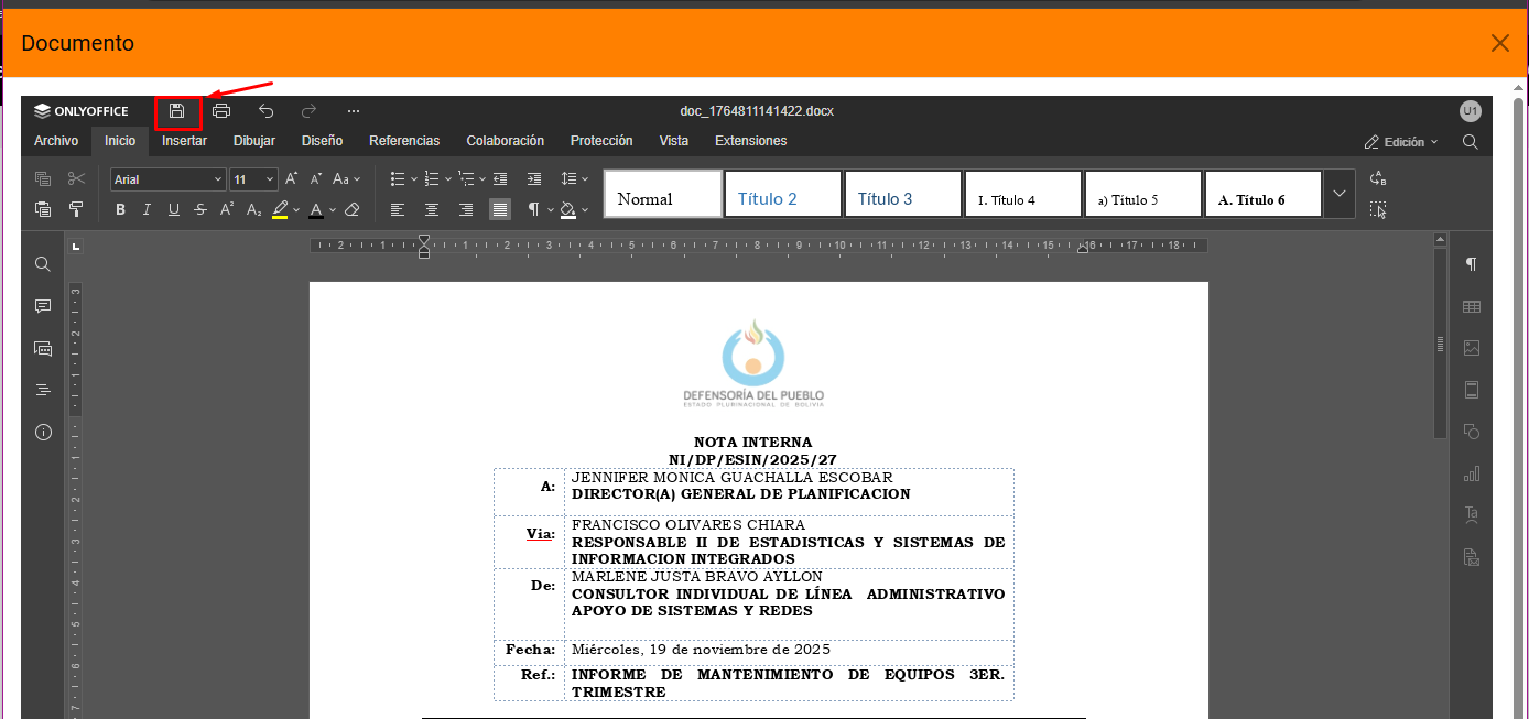 Posteriormente se mostrara el documento en el editor de OnlyOffice, donde se podrá editar la plantilla de nota interna de acuerdo a necesidad.