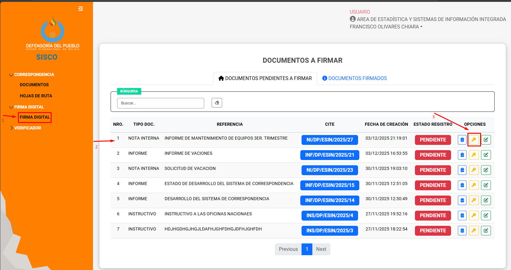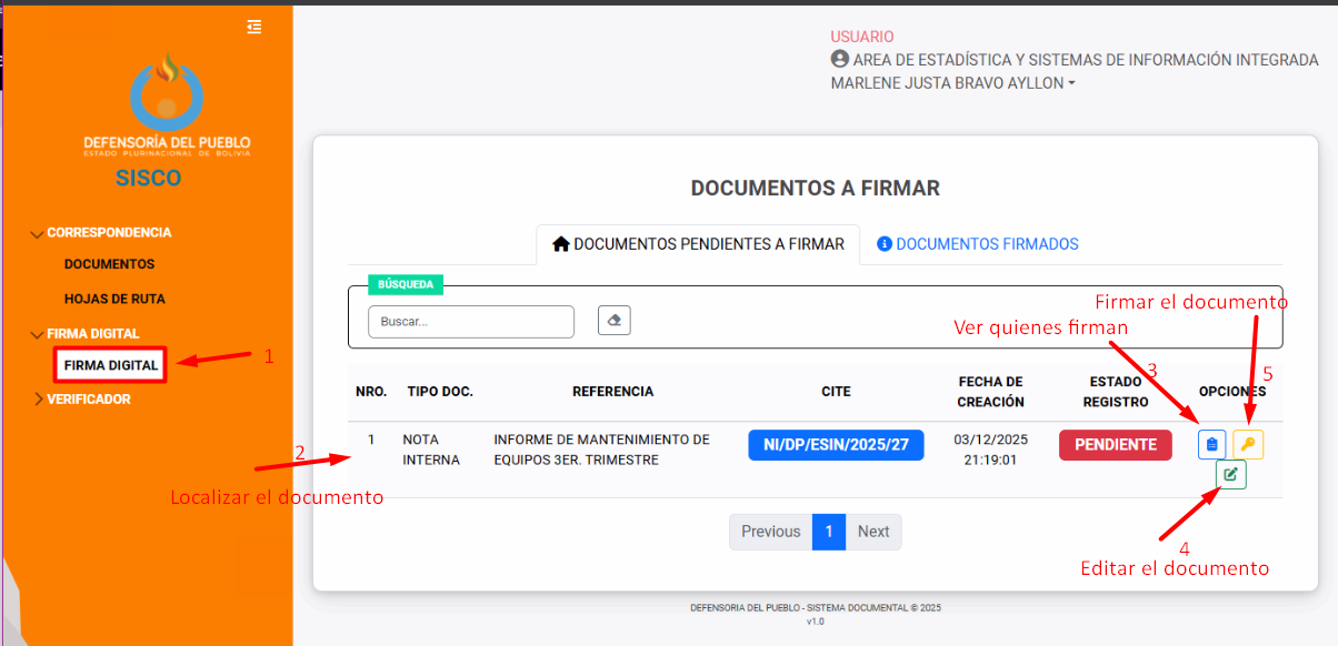 Para realizar la firma en el documento, en el menú lateral izquierdo seleccionar FIRMA DIGITAL, localizar el documento, se puede ver quienes deben firmar el documento, todavía se puede editar el documento, en caso de no estar seguro de proceder a firmar.