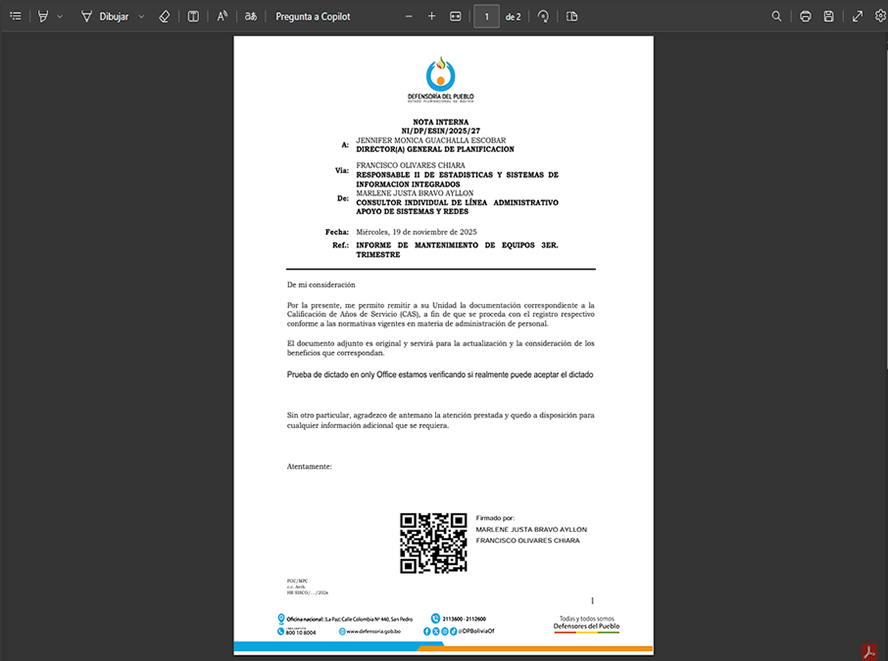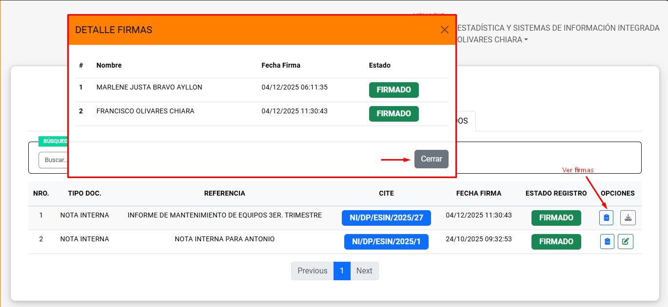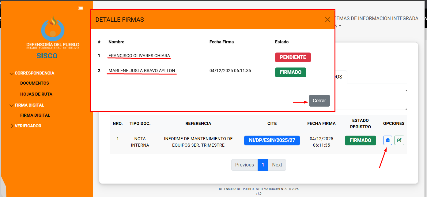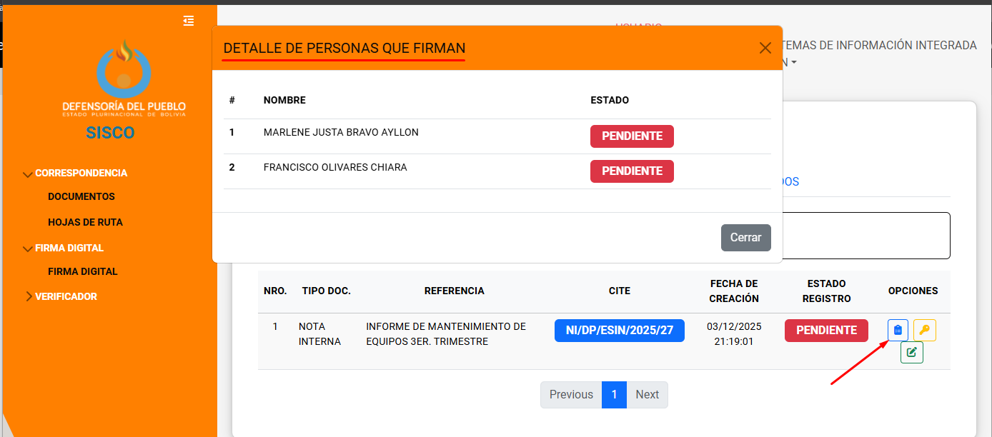 En caso de hacer clic en el icono de quienes firman se mostrar la siguiente ventana.