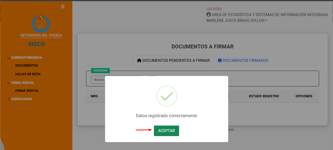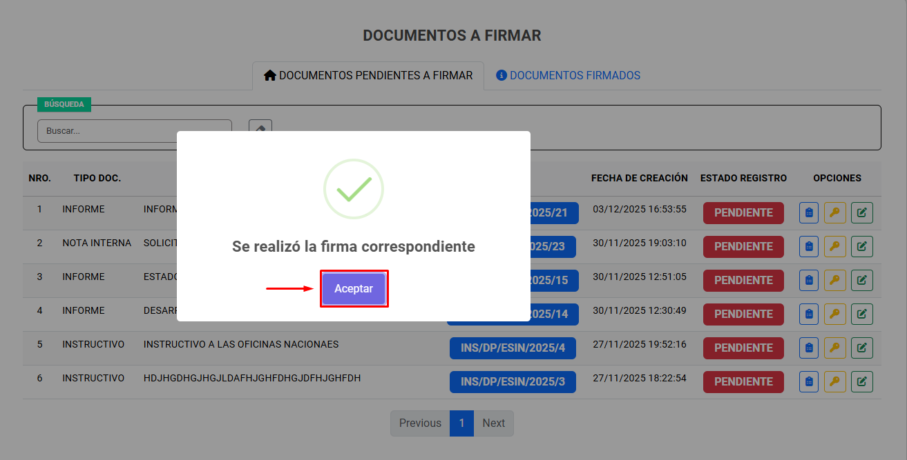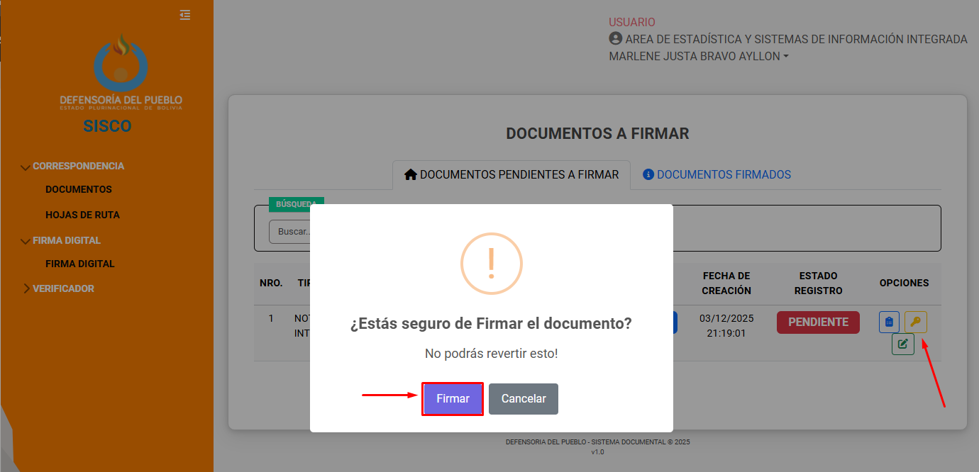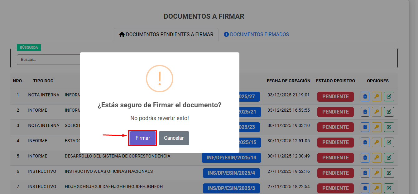Si se ha hecho clic en el botón de firmar (icono de llave), el sistema muestra la confirmación para la firma. En caso de estar seguro clic en Firmar.