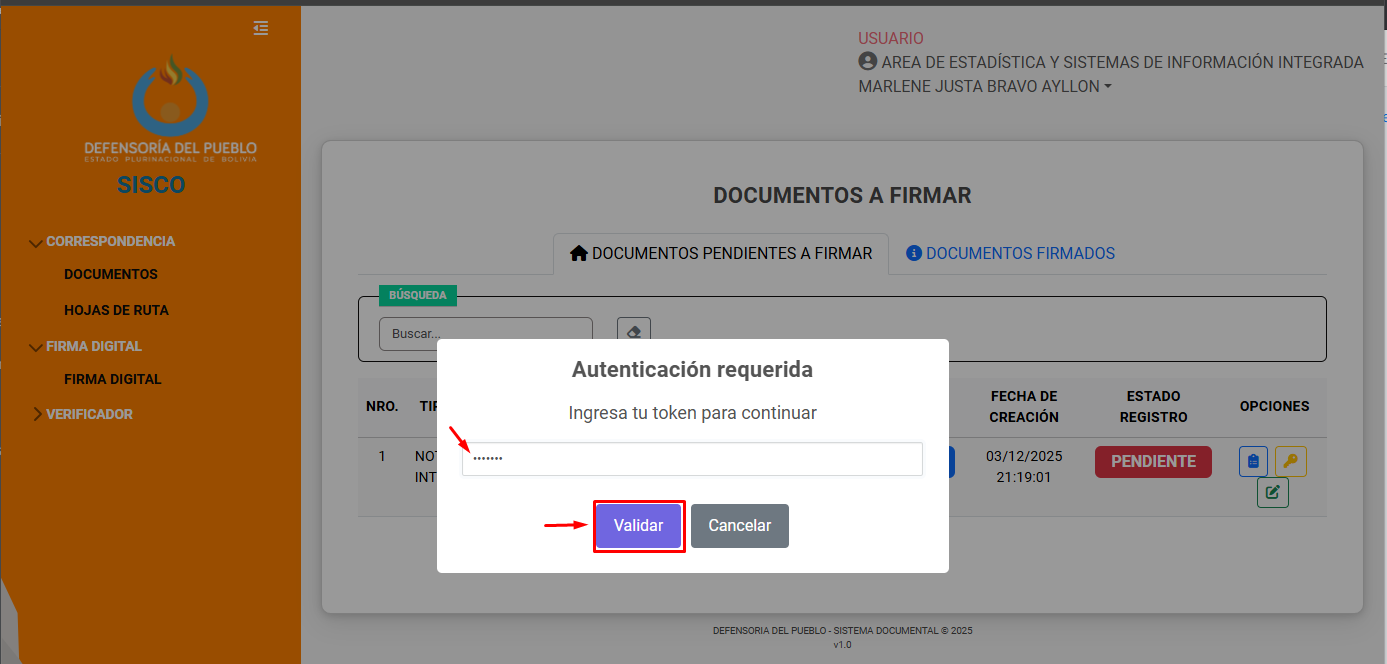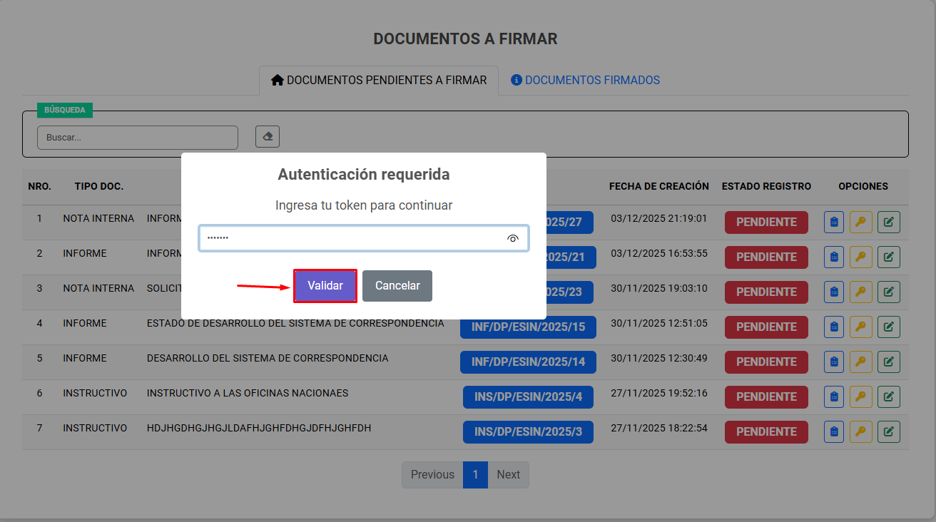 Posteriormente el sistema pedirá el token del usuario para proceder con la firma, al presionar en Validar se habrá realizado la firma digital del documento. Si correspondía a la ultima firma, el documento ya no se podrá editar.