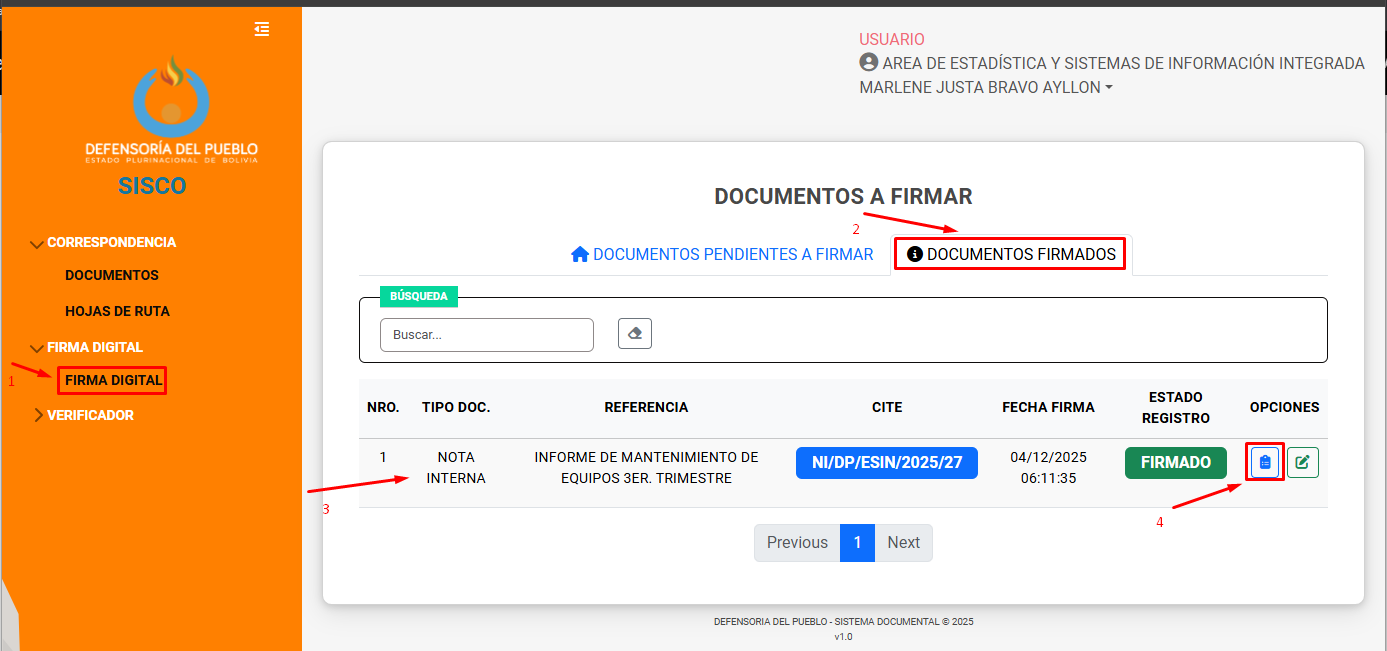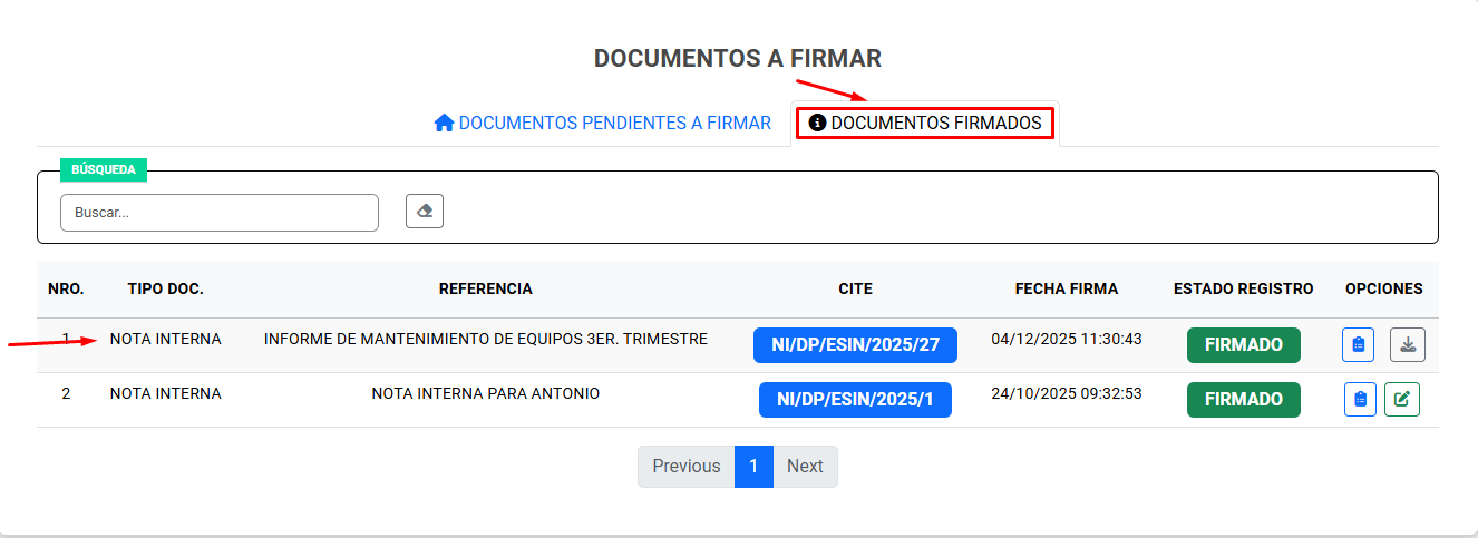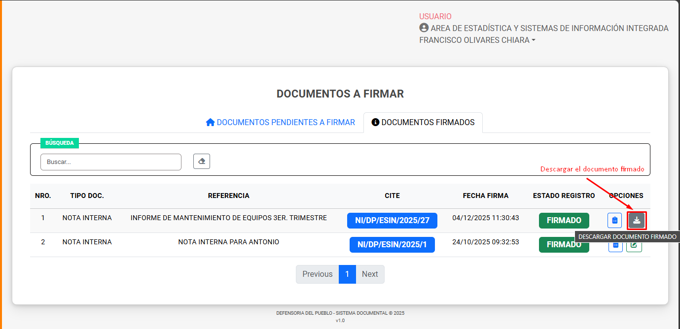 Firma Digital Interna: Proceso mediante el cual un usuario registrado valida oficialmente un documento en el sistema.