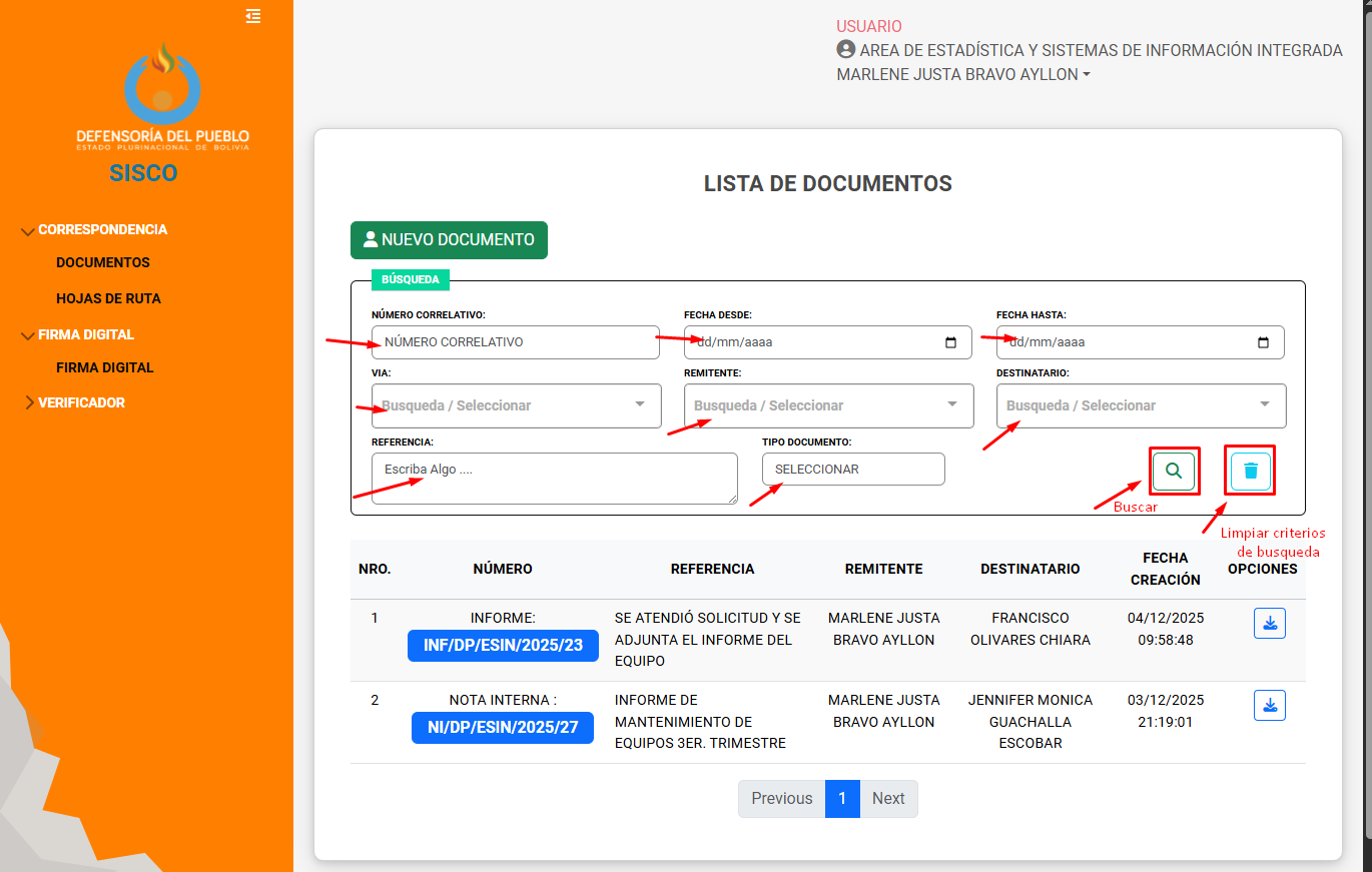 El sistema proporciona un área de búsqueda de documentos generados, que se puede personalizar de acuerdo a requerimiento.