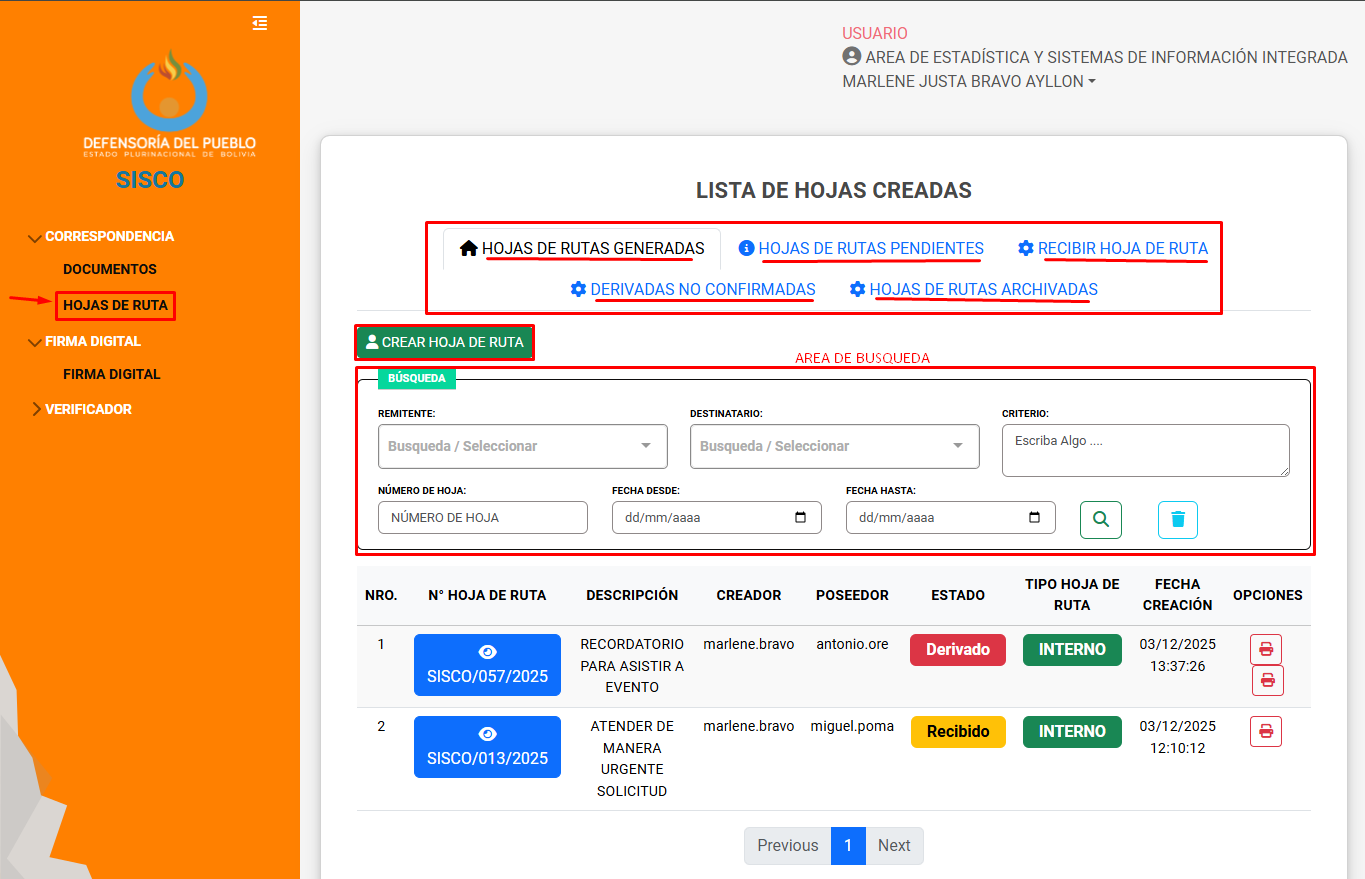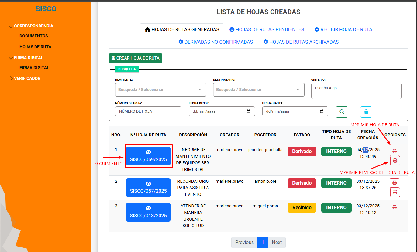 En la parte inferior del modulo de Hojas de ruta se muestra el listado de hojas de ruta generadas, es posible hacer el seguimiento a la hoja de ruta.