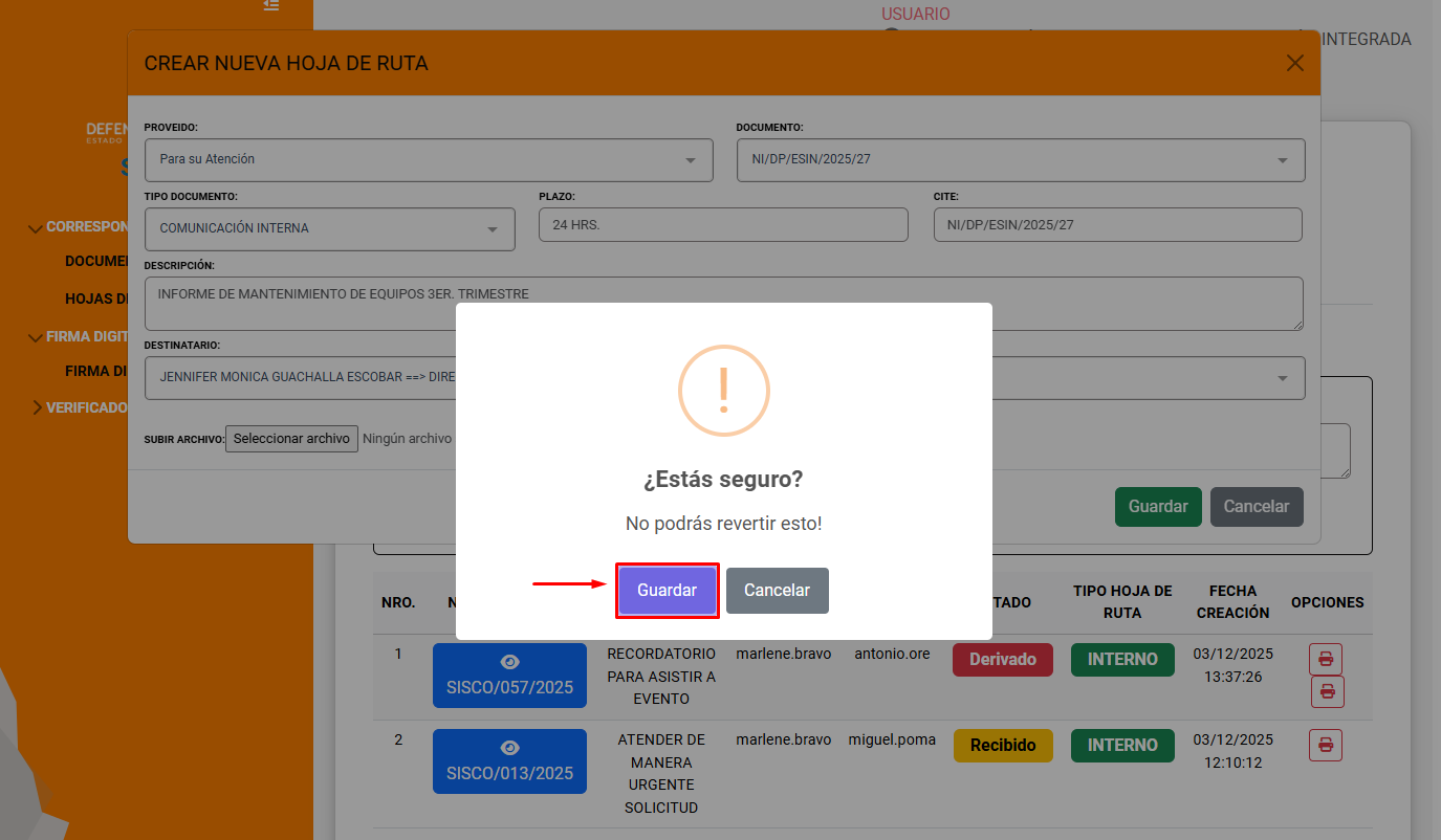Este mensaje confirma que la hoja de ruta se creo con éxito.