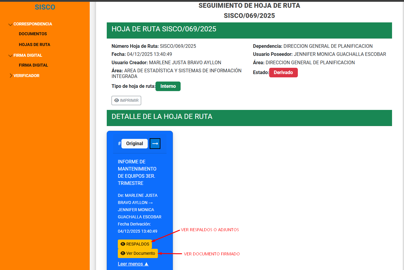 Al hacer clic en el icono azul, correspondiente al numero de hoja de ruta el sistema muestra la información de su creación y la ruta que haya recorrido.