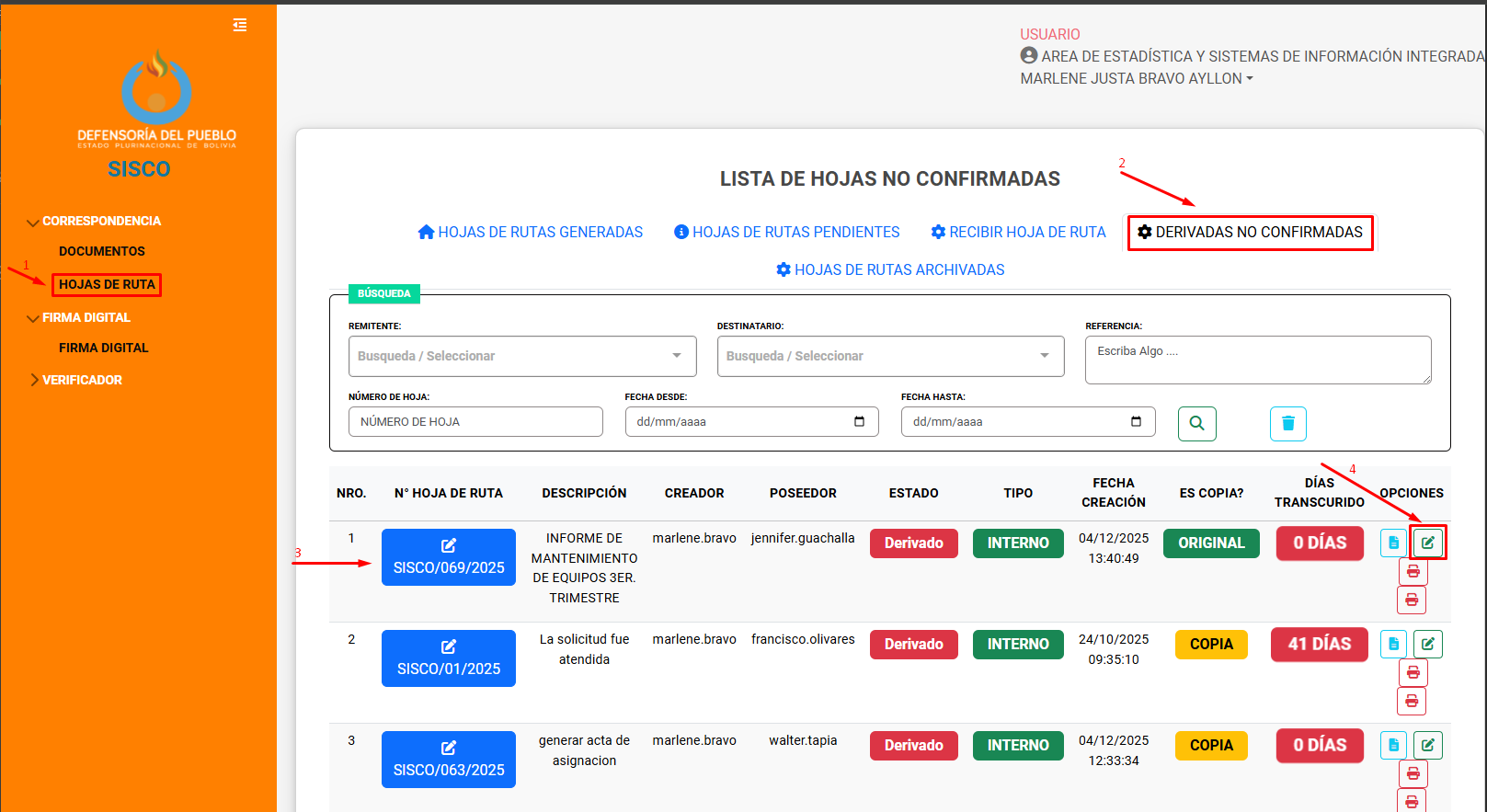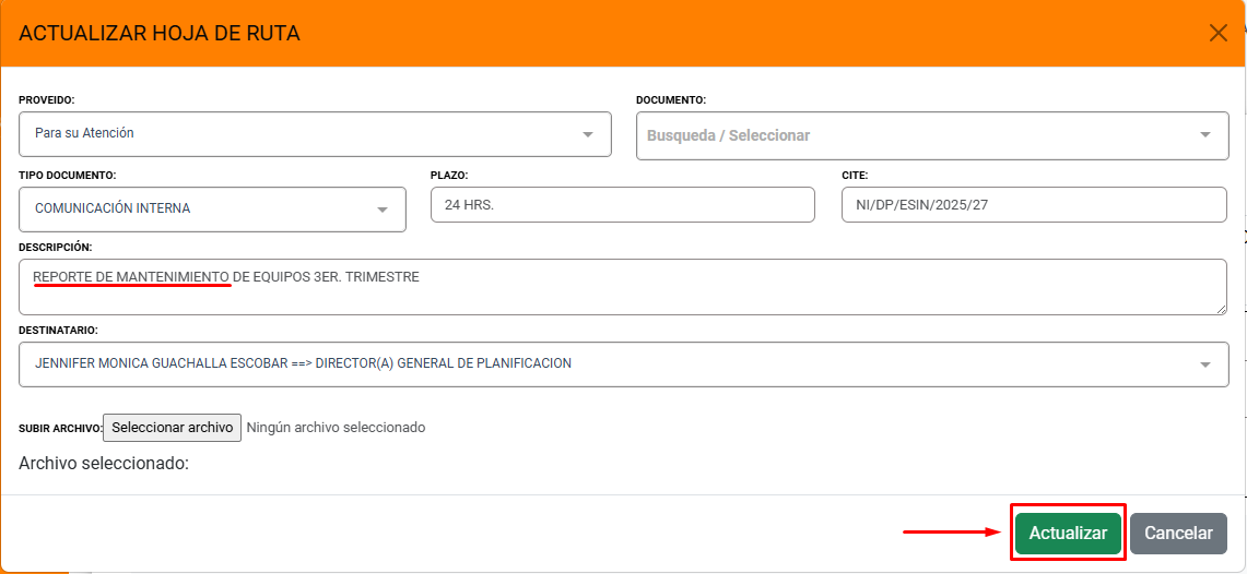 En el caso de que una hoja de ruta se haya derivado por error a otra persona, o sea necesario cambiar algún dato: Proveído, documento, tipo de documento, CITE, descripción o destinatario. Sera posible si el destinatario no ha recibido la hoja de ruta, para la modificación proceder de la siguiente manera: